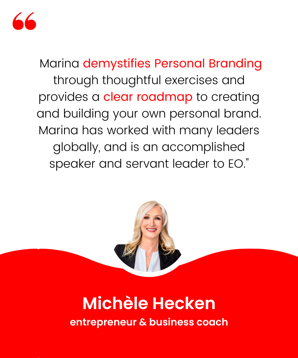 She is a tenured member of Entrepreneurs' Organization (EO), having served in local, regional, and global leadership roles, and is also an EO-Certified Global Speaker. Co-Founder of a personal branding agency called Brand of a Leader, Marina has been quoted and referenced in such publications as Inc.com, Forbes.com, Fast Company, Success Magazine, Wall Street Journal and the Financial Post, reaches 2.5+M people each year on LinkedIn, and has spoken to audiences of entrepreneurs and business executives in North America, Asia, Europe, and the Middle East.